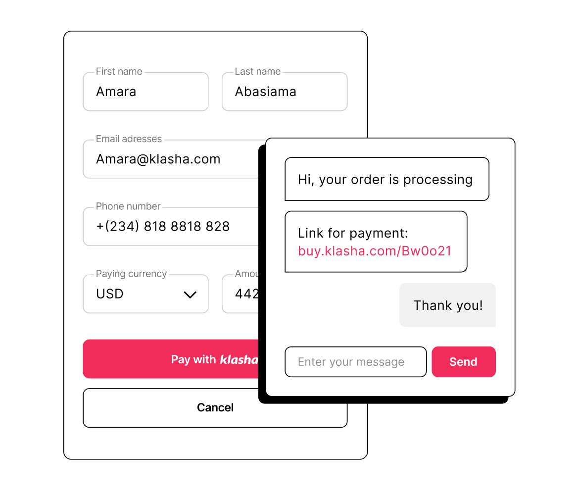 Send a Klasha Payment Link via WhatsApp or Instagram to collect payments in African currencies and receive payouts directly into your bank accounts in GBP or USD.